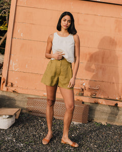 • Simple sleeveless linen crop top with a high, rounded neckline.