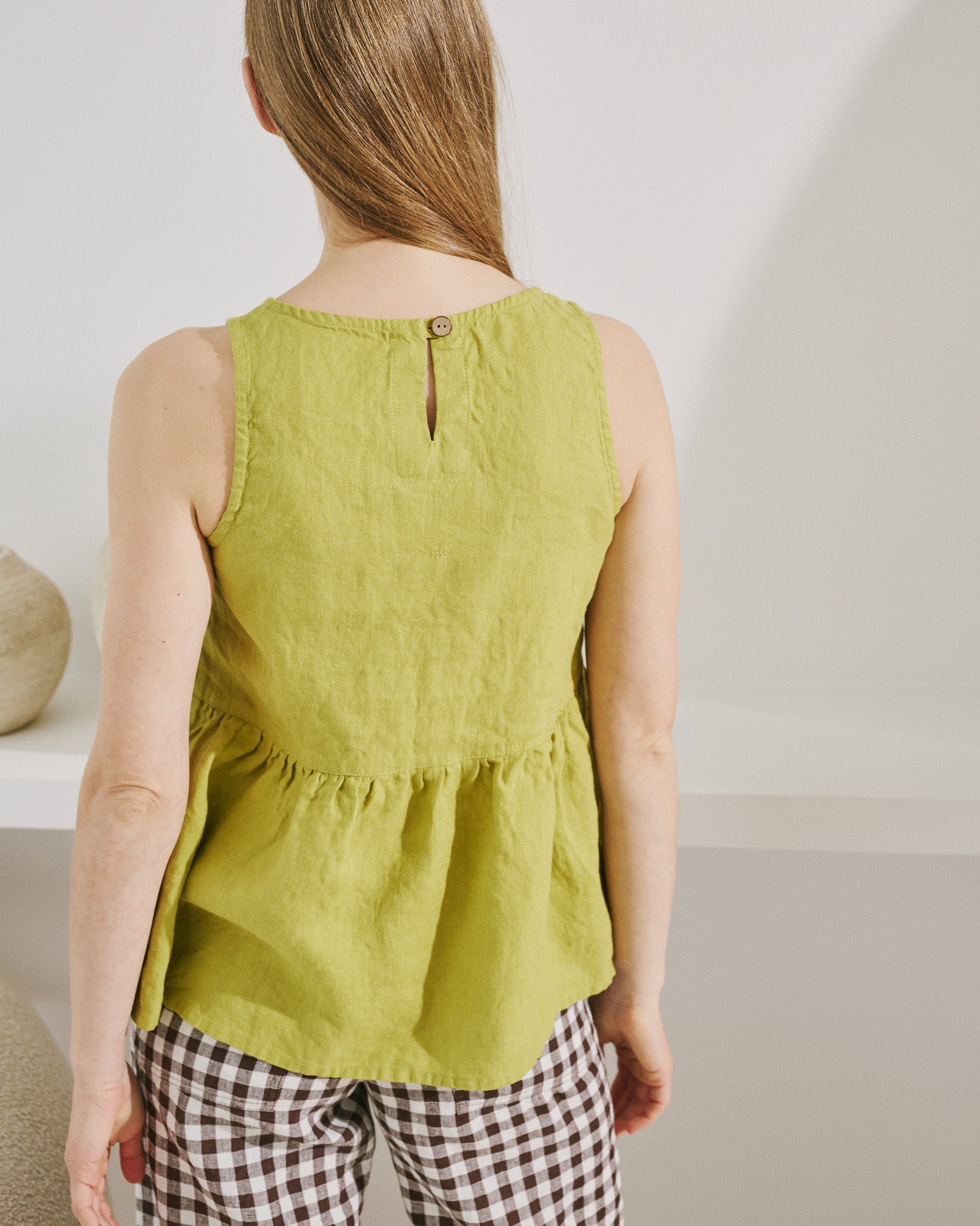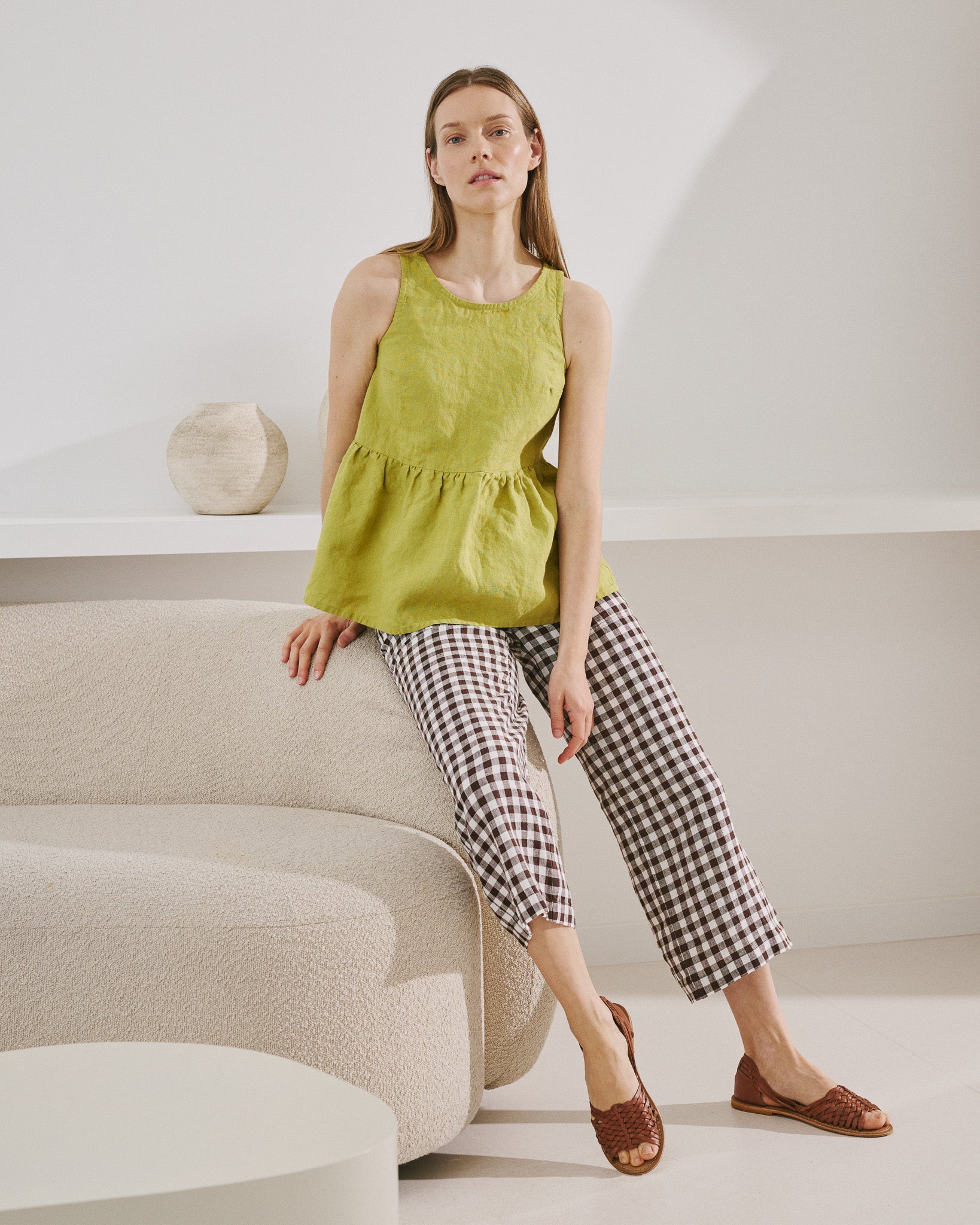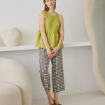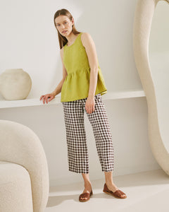 • Sleeveless linen peplum top with a high, rounded neckline.
