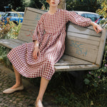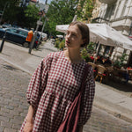 • The model is 5'8" tall (174 cm), size S, and wears a dress in medium weight 'Marsala gingham' pattern.