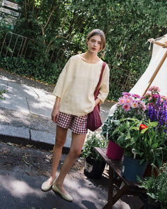 • The model is 5'8" tall (174 cm), size S, and wears a longer shirt in medium weight 'light butter" color.