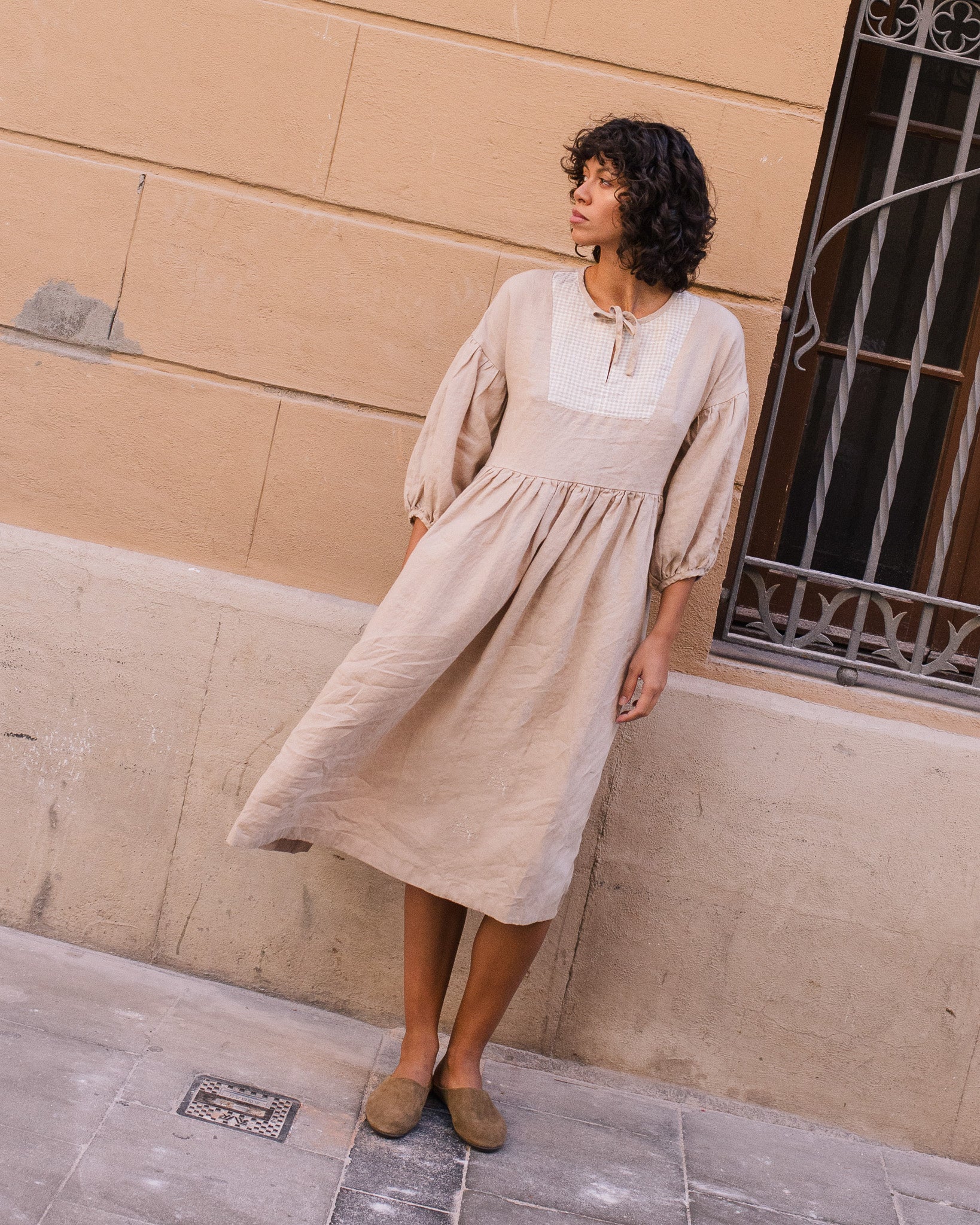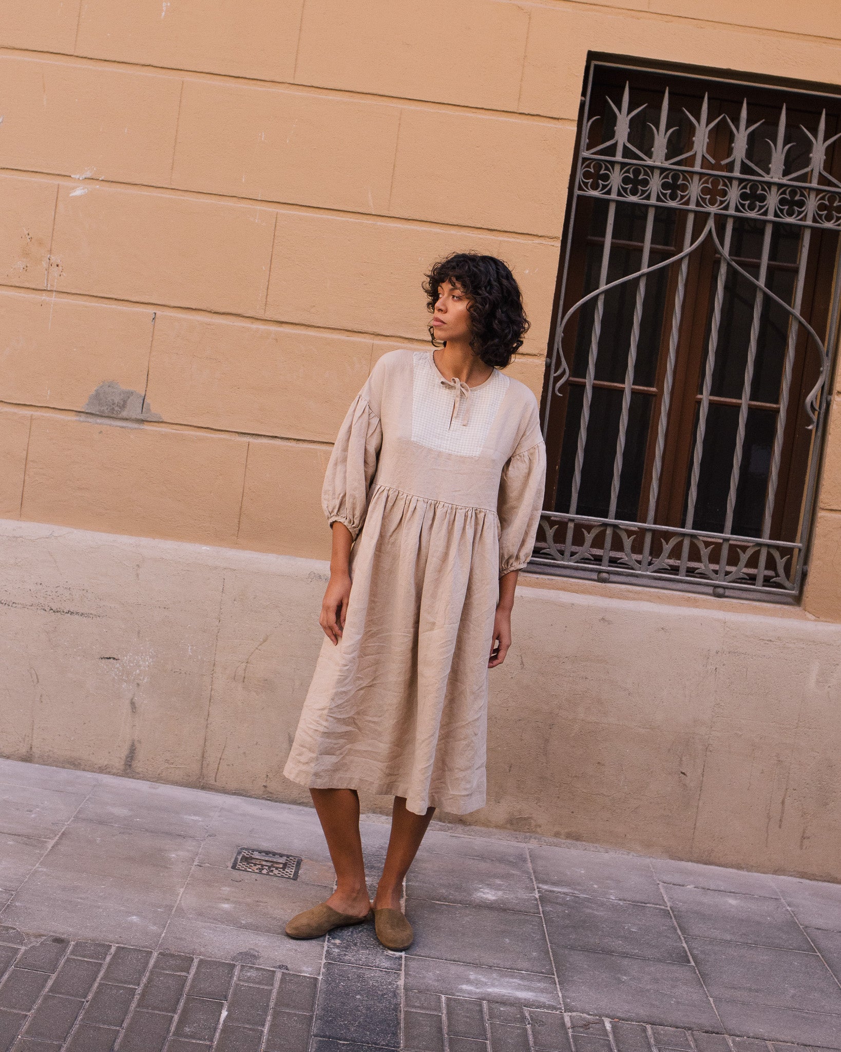 This is absolutely my favorite dress from NPL. I got it in khaki with a raised waistline and buttons on the top half. It's cute and flowy, looks great with and without a belt. I hope NPL will keep this style and offer it in medium weight linen as well.