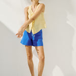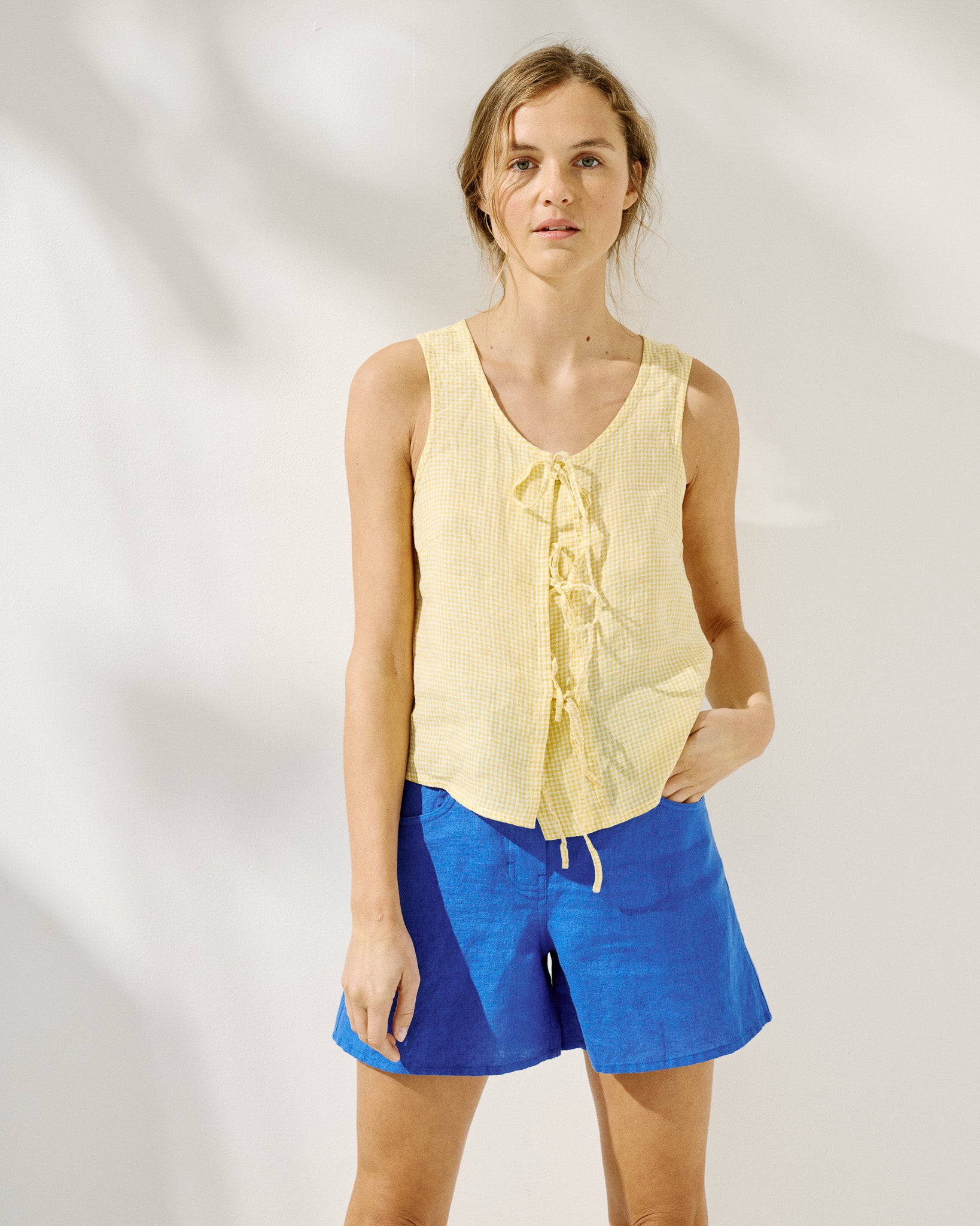 • Model wears a top in light yellow checks, paired with Soller shorts in medium weight cobalt blue.