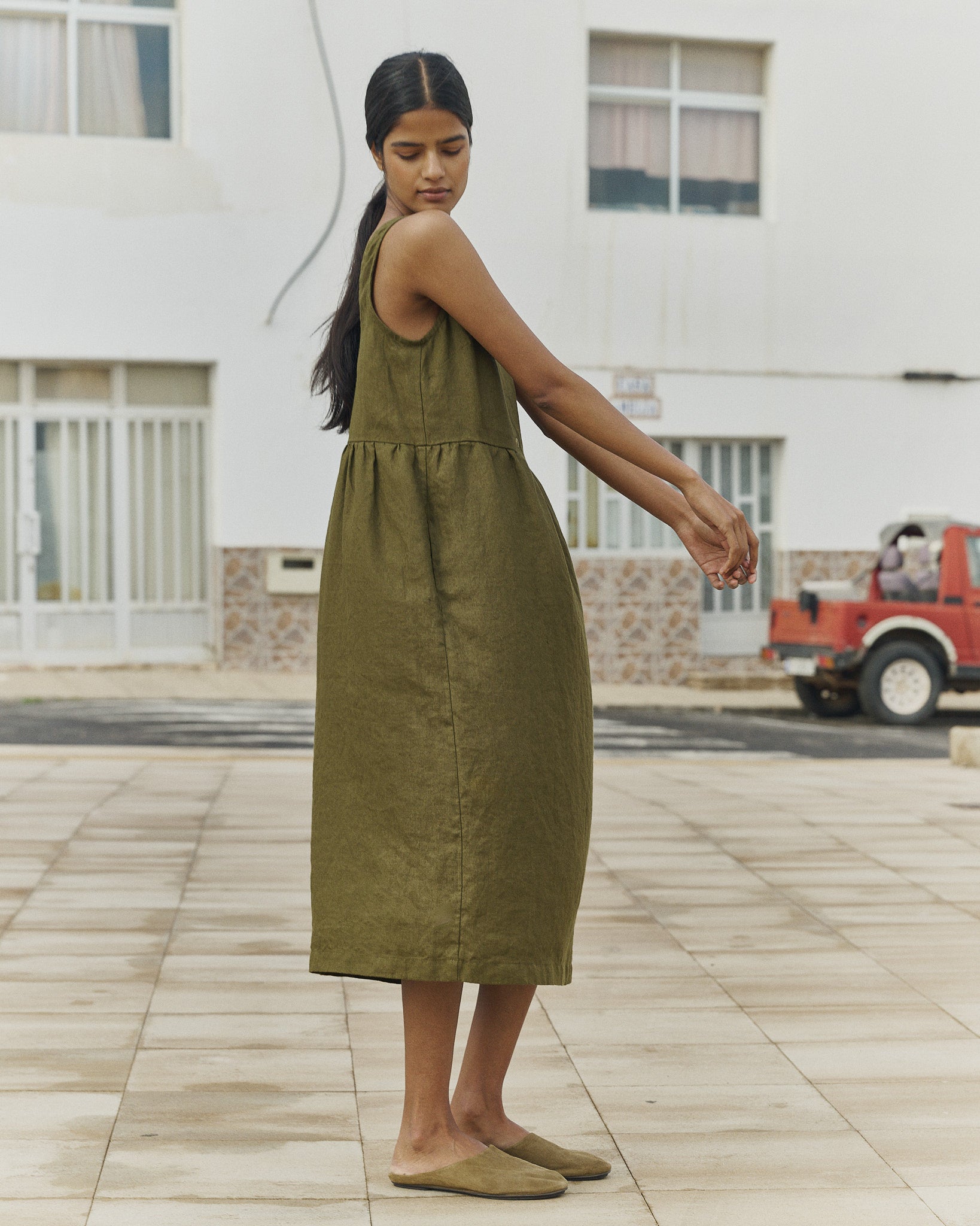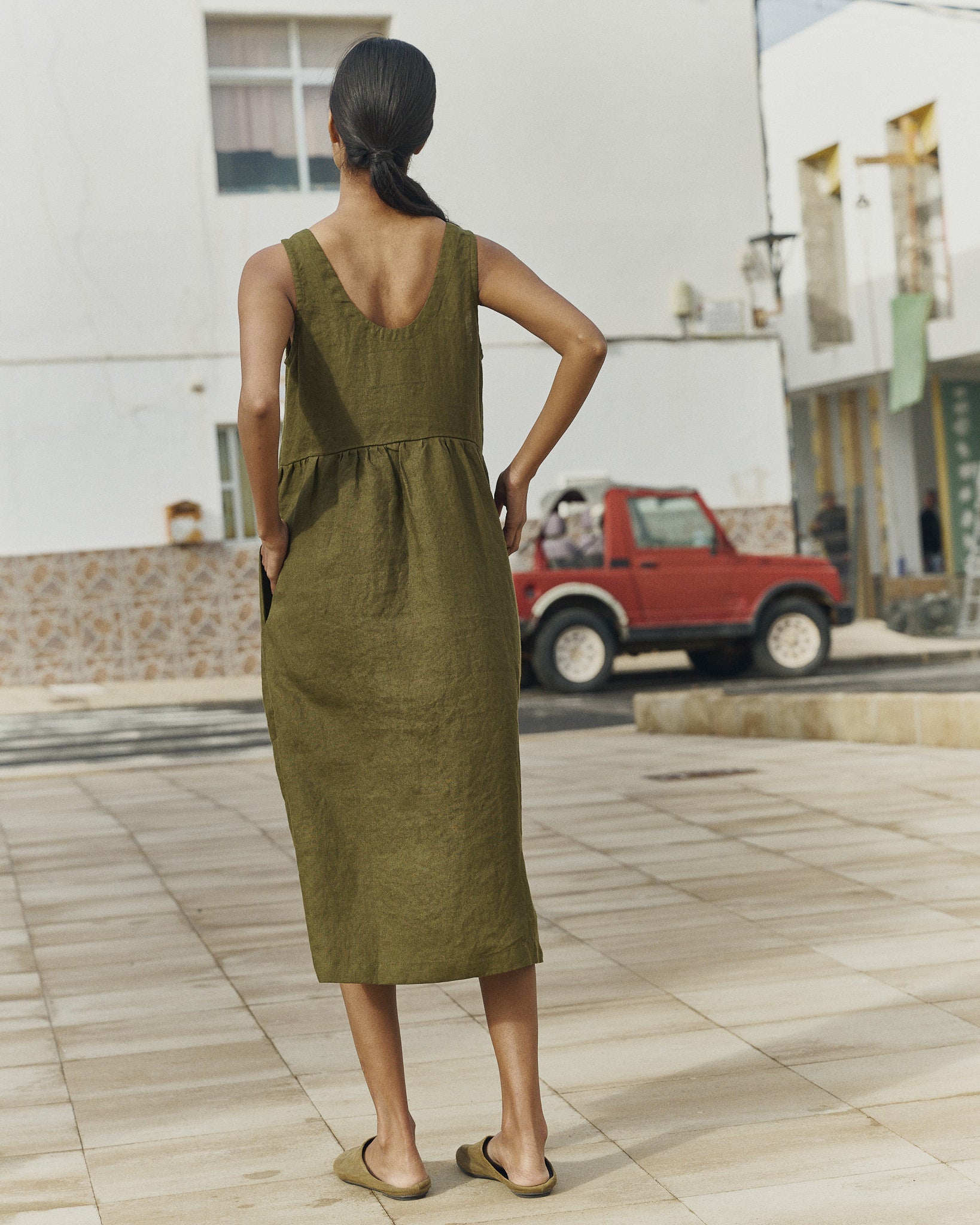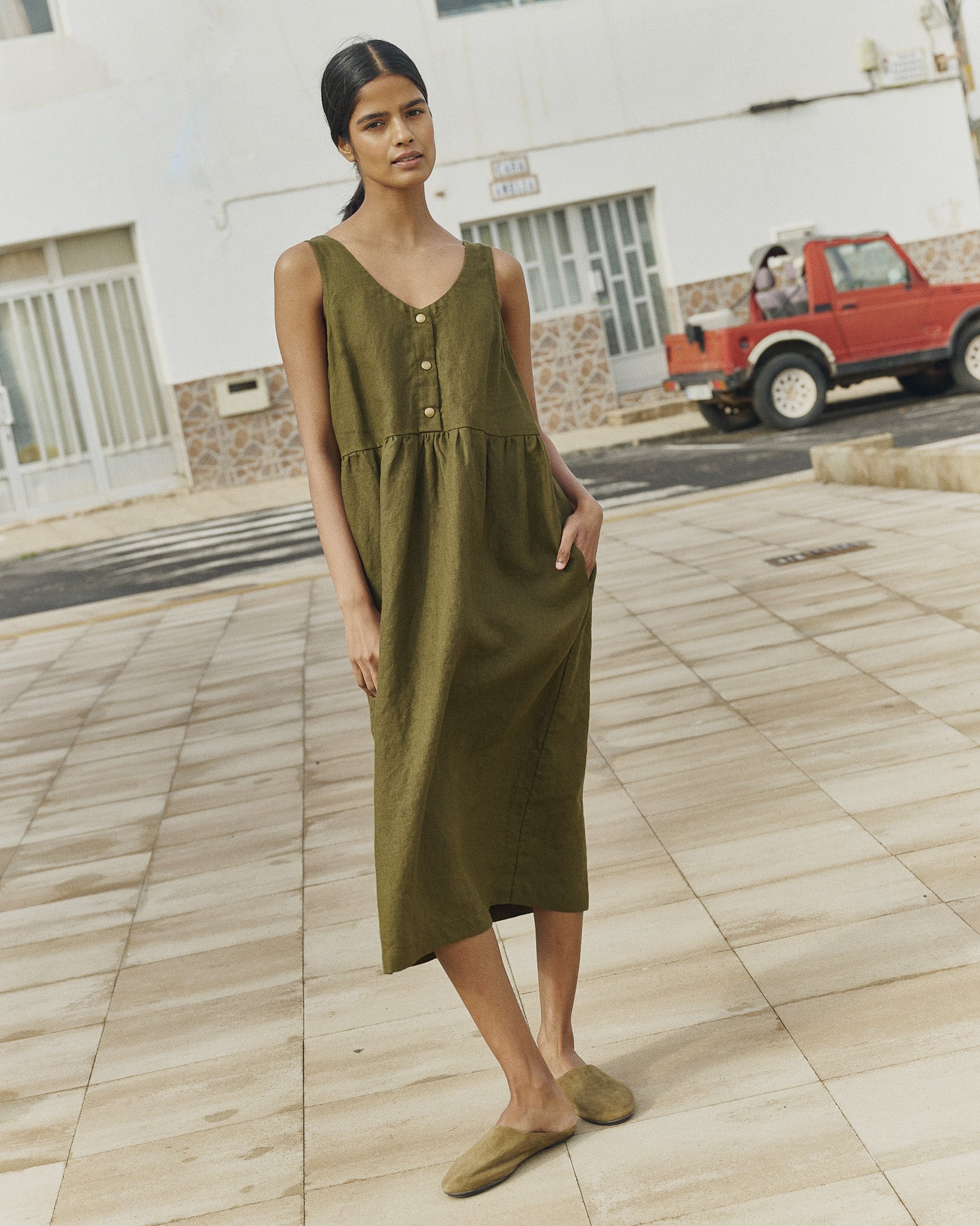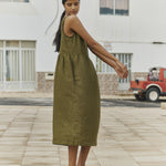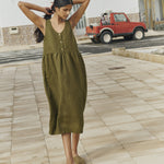 • Washed, soft, easy shape sleeveless linen dress with a softly gathered skirt and pockets set into side-seam at both hips.